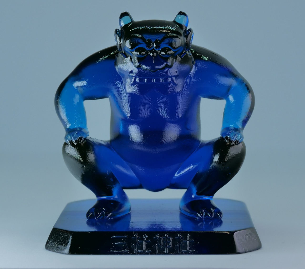 青森県平川市日沼にある三社神社の青色(水色)の鳥居の鬼コです。